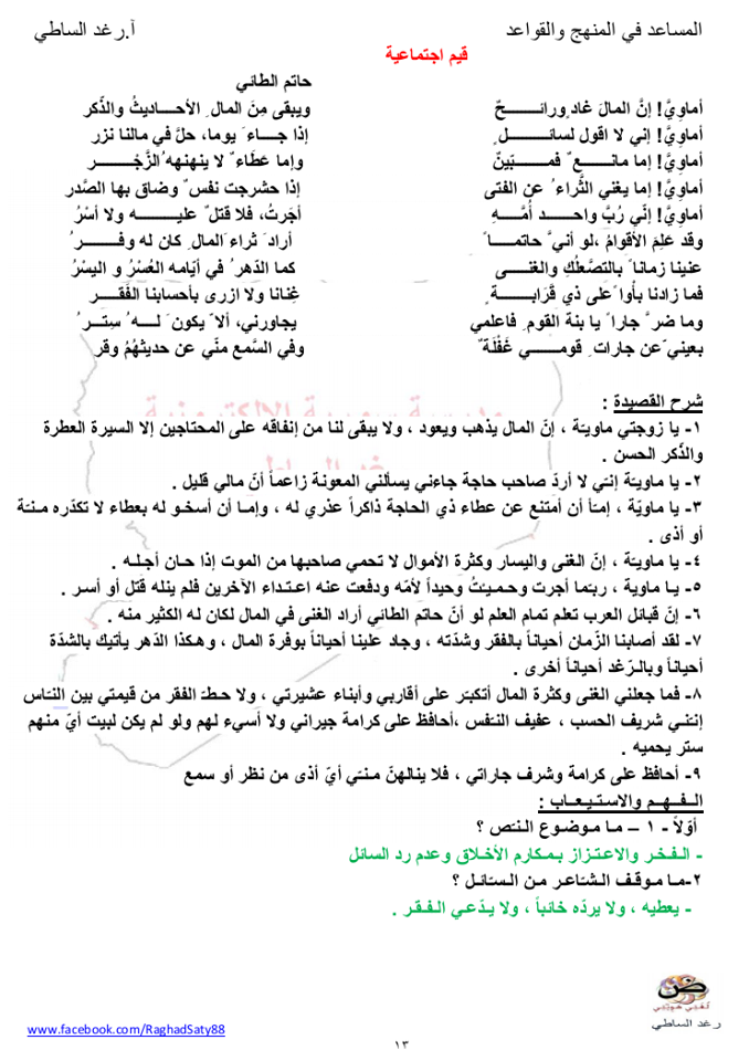 قصيدة قيم اجتماعية شرح إعراب حل آ رغد الساطي اللغة العربية للصف التاسع 2020 Facebook