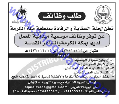 ملتقى التأهيل و التوظيف السعودي تعلن لجنة السقاية والرفادة بمنطقة مكة المكرمة عن وظائف موسمية ميدانية
